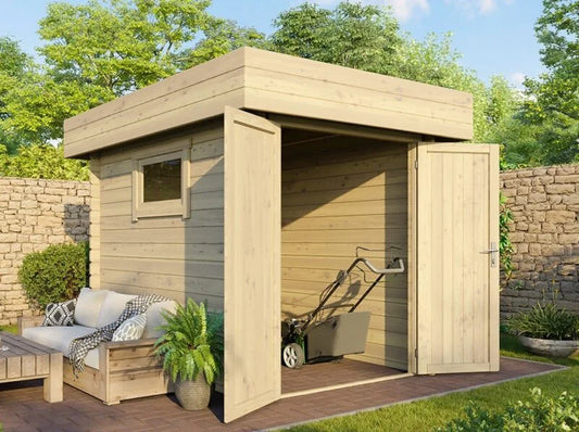 Abri de jardin bois Ep. 28mm, 13 m² – toit plat – Neuf – DESTOCKAGE